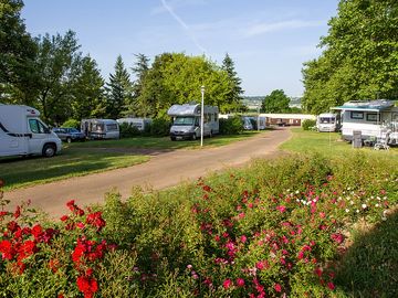 Befestigter und grasbewachsener Stellplatz mit Stromanschluss