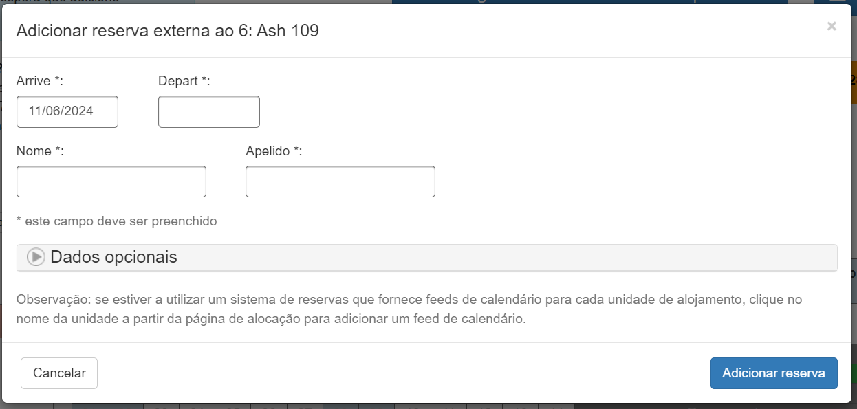 Mesmo que tenha feeds de calendário configurados num lote/unidade, ainda é possível adicionar reservas externas manualmente.