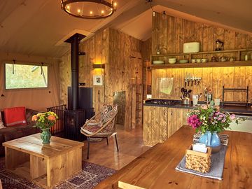 The luxury safari tents here are in a roomy field with trees and plants, a wild meadow and its little orchard, which is the main communal space. Each sleeps six people and up to two dogs, in a main bedroom, twin bedroom and double cabin bed; all beds are made up with Egyptian cotton bed linen and cosy duvets. Safari tents also have their own bathroom with a shower, flushing toilet, basin, hot water and heated towel rail; log burners are provided indoors too for cosy evenings.
